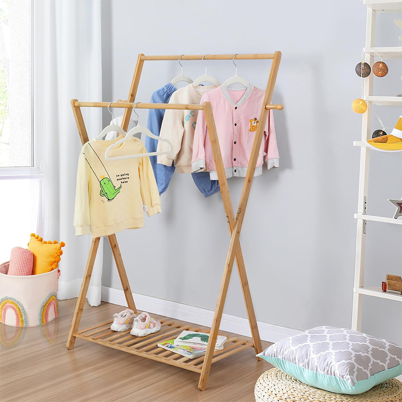 ● Estrutura sólida e estável: este rack de vestuário para crianças de haste dupla feita de bambu de alta qualidade, sólida e durável, a estrutura X fornece boa estabilidade e equilíbrio, peso leve para se mover pela casa
